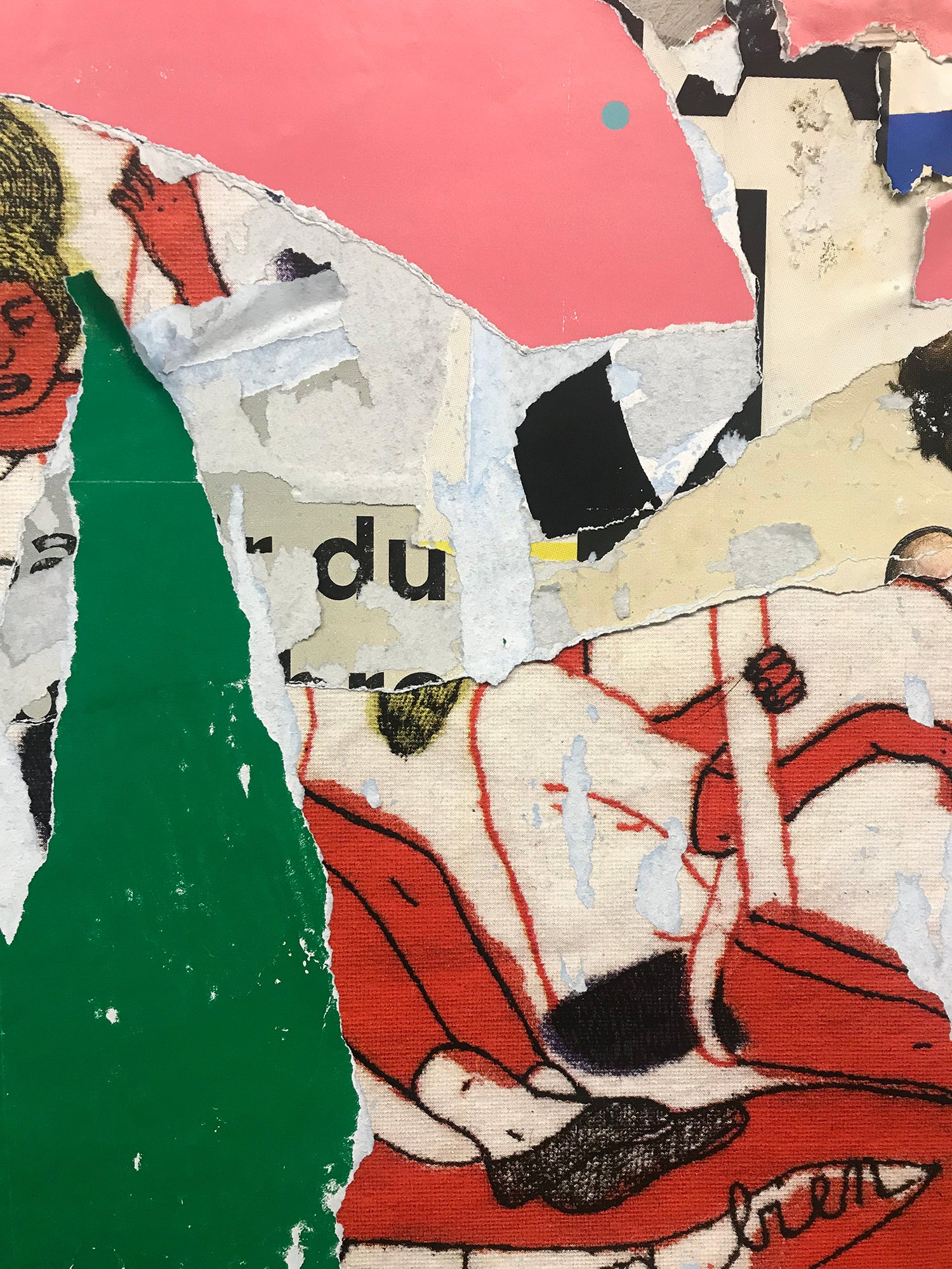 De l’autre côté, je suis venue m’installer assez jeune à Paris pour étudier l’art et j’ai rapidement ressenti une fascination pour cette ville. J’y vois de la magie dans chaque recoin. J’allais partout et tout le temps, et pour ça je prenais énormément le métro. C’était devenu Lucie dans le métro. Les affiches que je croisais dans les dédales des couloirs, complètement déchirées parfois, me laissaient entrevoir de la beauté et de l’inattendu. J’avais envie de faire ressortir quelque chose de ces entrailles de Paris, du métro.